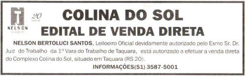 Colina do sol à venda? Foi publicado no jornal ABC Classificados de 24 de setembro de 2009, encarte do jornal NH, da região de Novo Hamburgo, no Rio Grande do Sul o aviso de Edital de Venda direta do Complexo Naturista Colina do Sol. clique sobre a figura acima e veja o anúncio no contexto do jornal. (enviado em 2/10/09 por Richard Pedicini) NOTA DE ESCLARECIMENTO