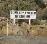 clean, no nudism here” (Mantenha a praia limpa, nenhum nudismo aqui).